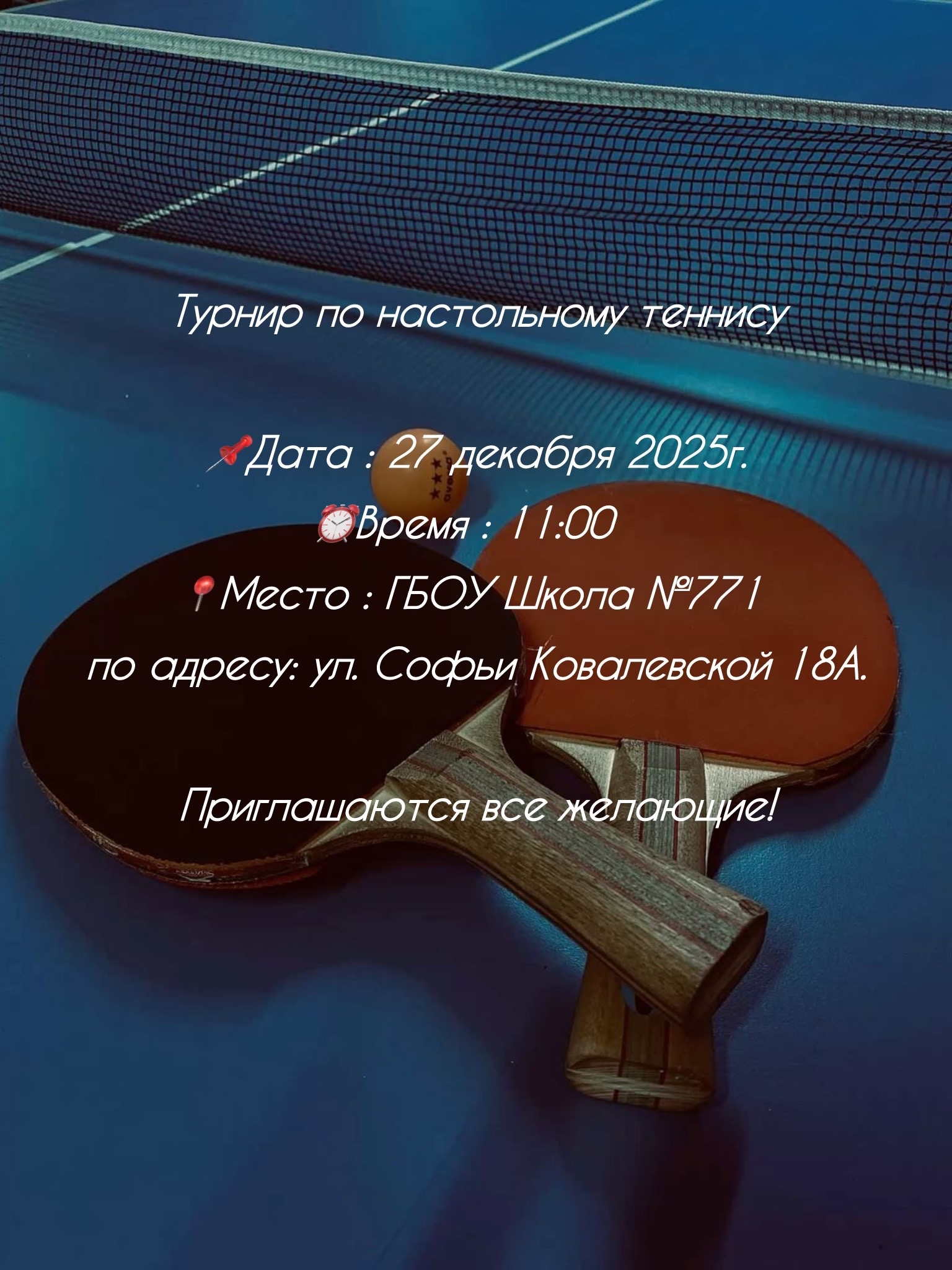 Молодёжный Клуб «Логос» при Храме Матроны Московской в Дмитровском г. Москвы приглашает принять участие в турнире по настольному теннису, который состоится 27 декабря 2025г. в 11:00 часов и будет проходить в ГБОУ Школа №771 по адресу: ул. Софьи Ковалевской 18А.