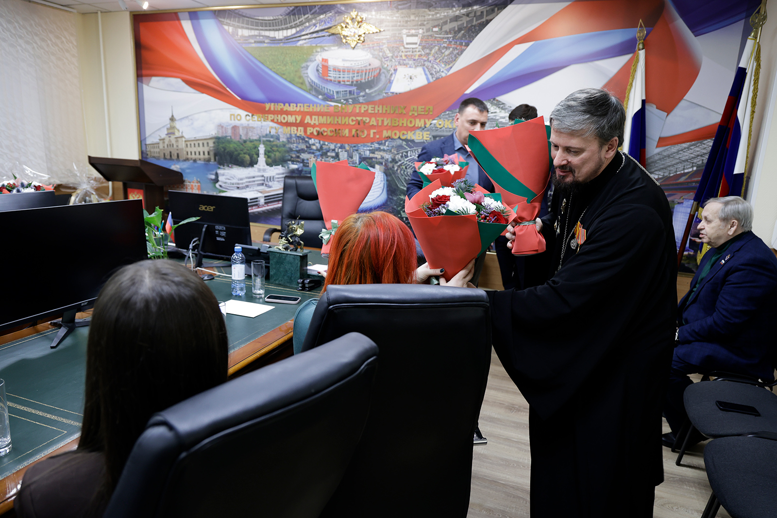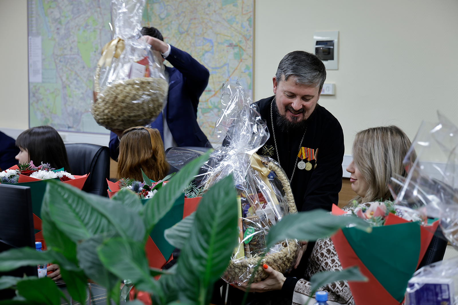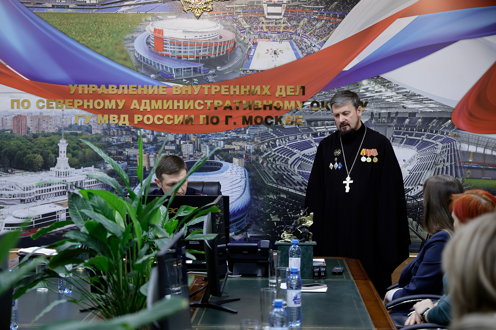 Отец Дионисий выступил с пастырским словом перед родственниками участников СВО, где выразил слова поддержки и утешения семьям погибших сотрудников МВД и тем, кто находится на реабилитации после тяжких ранений. Отец Дионисий обратил внимание присутствующих на то, что при храме блаженной Матроны Московской в Дмитровском создан Центр духовно-нравственной поддержки военнослужащих, ветеранов силовых структур Российской Федерации и членов их семей, где оказывается поддержка по укреплению социального, эмоционального и духовно-нравственного благополучия. В завершении, священником были сказаны теплые слова поздравления накануне наступающего Нового 2026 года и Рождества Христова, пожелав всем помощи Божией и заступничества Царицы Небесной Пресвятой Владычицы нашей Богородицы.