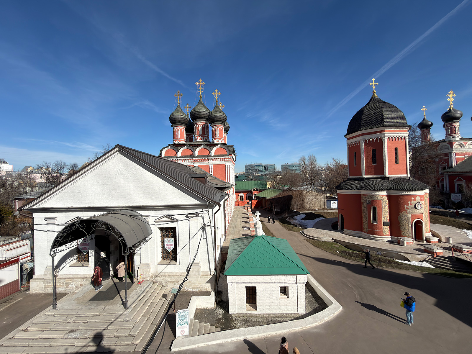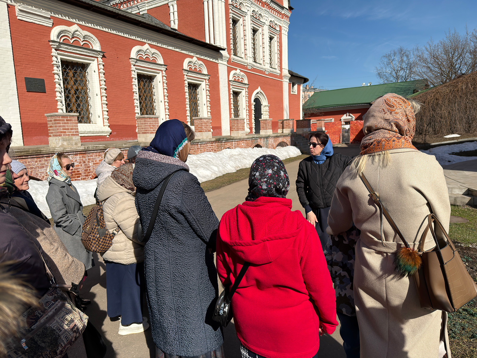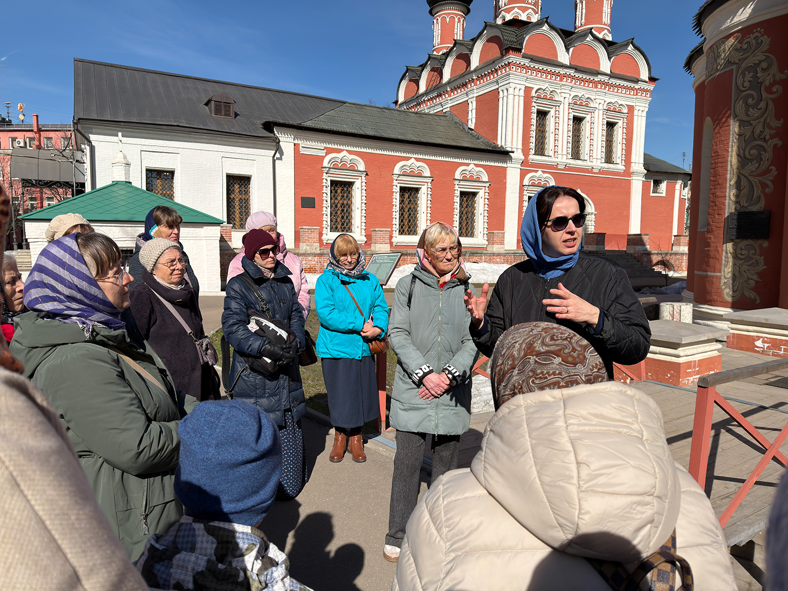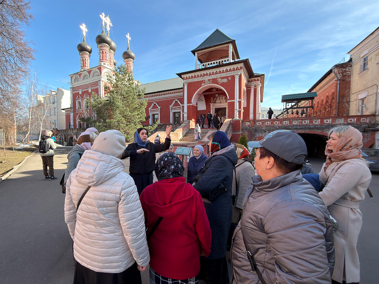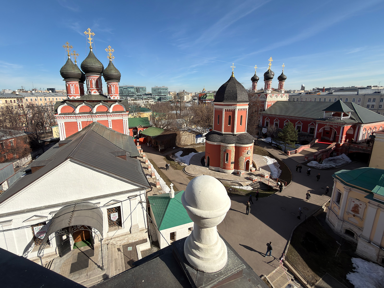 Сопровождая нас по его территории, наш гид Наталья показала нам все храмы, колокольню (с путешествием на ее смотровые площадки и в Покровский храм), и рассказала обо всех святынях, находящихся там. Ее живой рассказ позволил нам увидеть и прожить историю обители с древних времен до сегодняшнего дня. С высоты надвратной колокольни мы увидели дорогу к Кремлю, петляющую среди плотной жилой застройки, проложенную самим митрополитом Петром для “тайных” путешествий в город, и башни Кремля, и расположенный по соседству Сретенский монастырь, и многие другие храмы и культурные центры столицы. Мы прошли в Нарышкинские палаты и познакомились с экспозицией, посвященной новомученикам, и конечно же побывали в Сергиевском храме и поклонились списку Влахернской иконы Божией Матери.