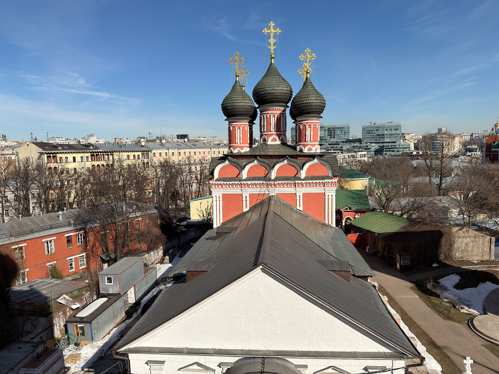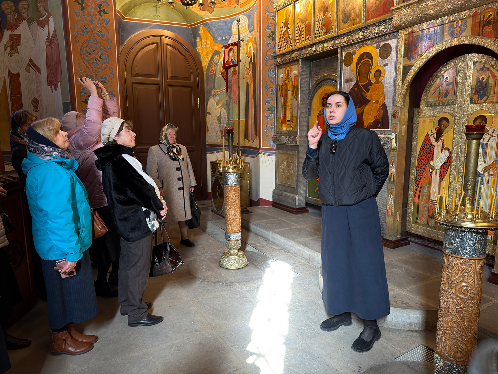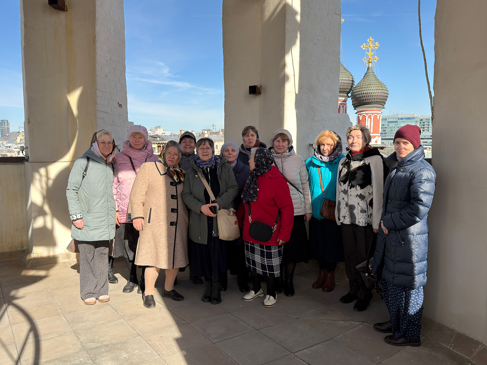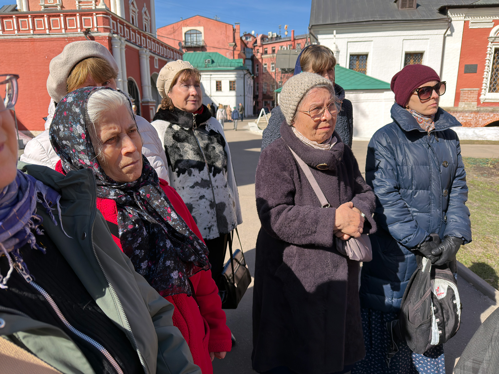 Сопровождая нас по его территории, наш гид Наталья показала нам все храмы, колокольню (с путешествием на ее смотровые площадки и в Покровский храм), и рассказала обо всех святынях, находящихся там. Ее живой рассказ позволил нам увидеть и прожить историю обители с древних времен до сегодняшнего дня. С высоты надвратной колокольни мы увидели дорогу к Кремлю, петляющую среди плотной жилой застройки, проложенную самим митрополитом Петром для “тайных” путешествий в город, и башни Кремля, и расположенный по соседству Сретенский монастырь, и многие другие храмы и культурные центры столицы. Мы прошли в Нарышкинские палаты и познакомились с экспозицией, посвященной новомученикам, и конечно же побывали в Сергиевском храме и поклонились списку Влахернской иконы Божией Матери.