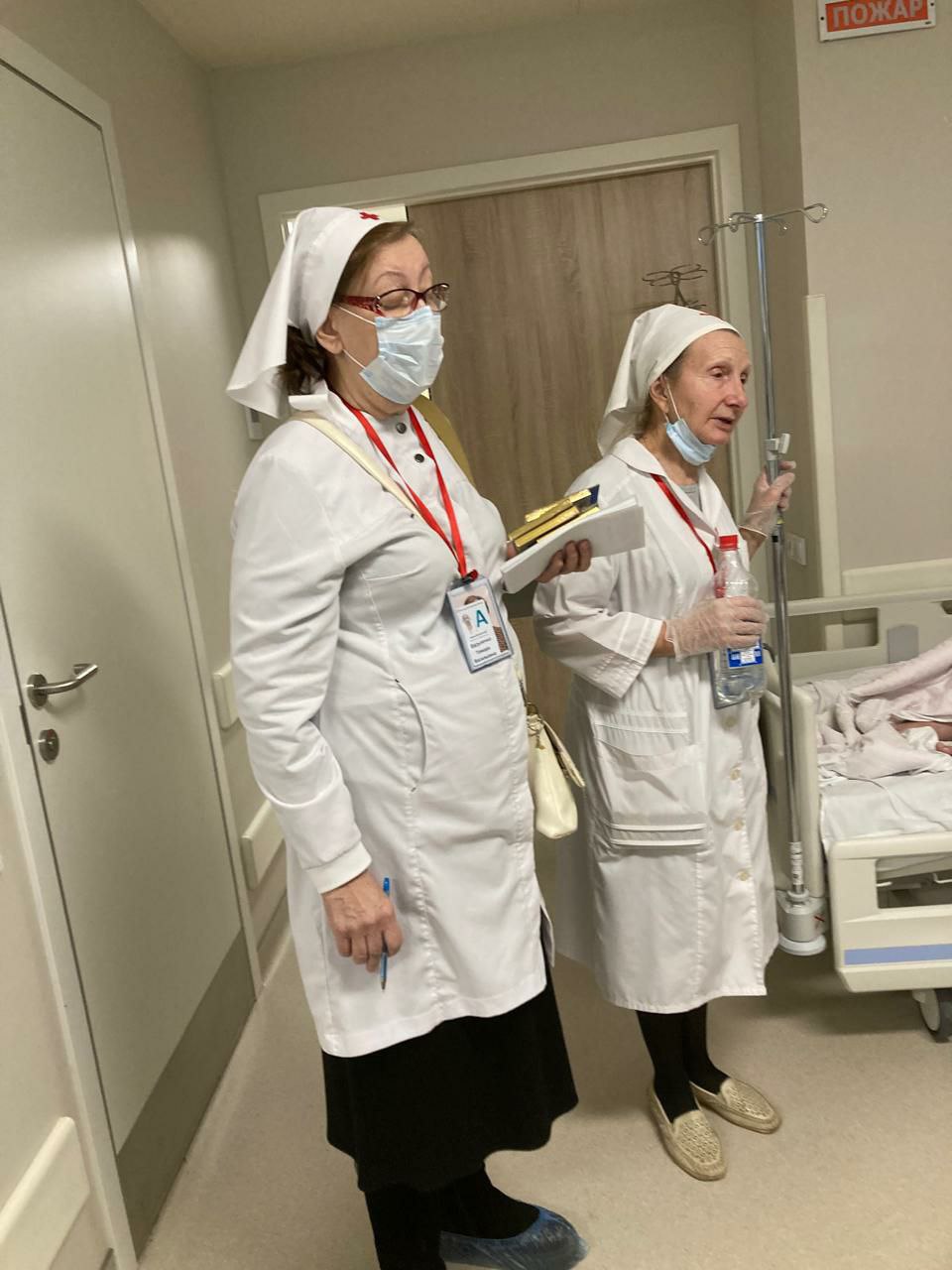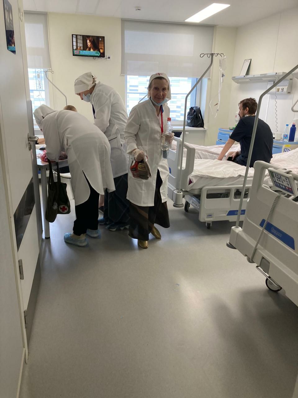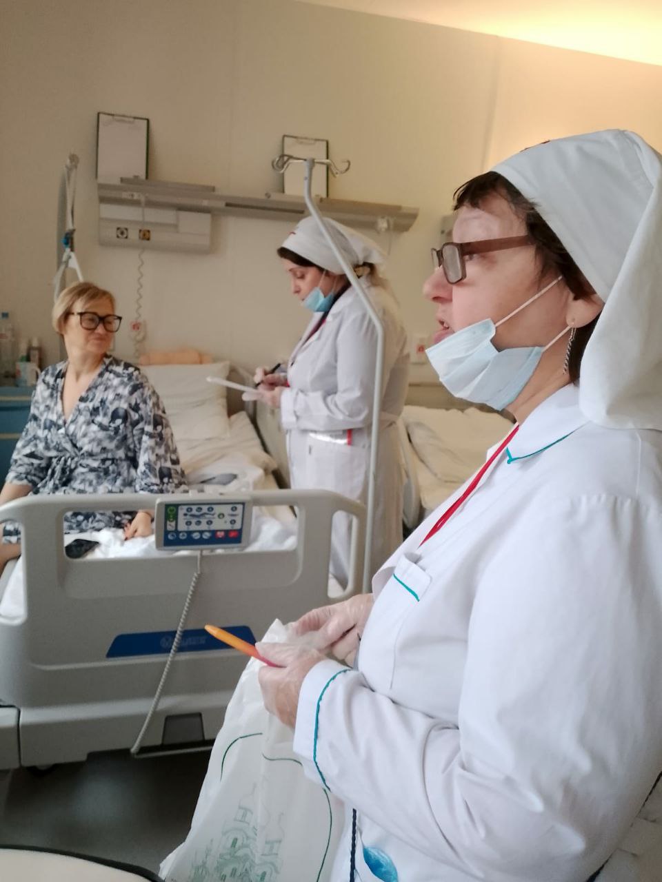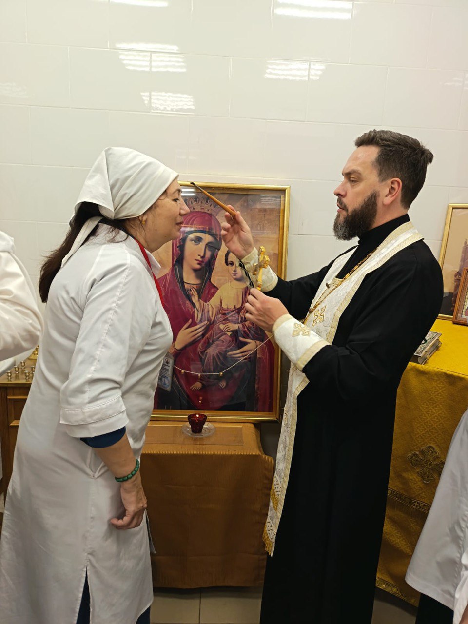 После молебна сестры милосердия совершили обход больничных отделений, поздравив врачей и пациентов с Богородичным праздником и раздав желающим освящённую воду и иконы святых-целителей.