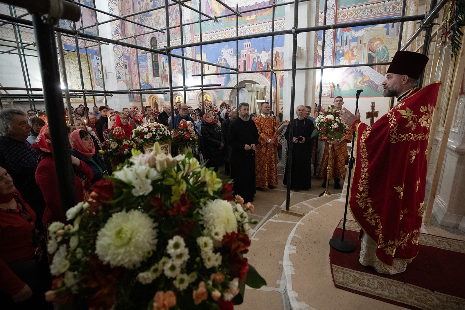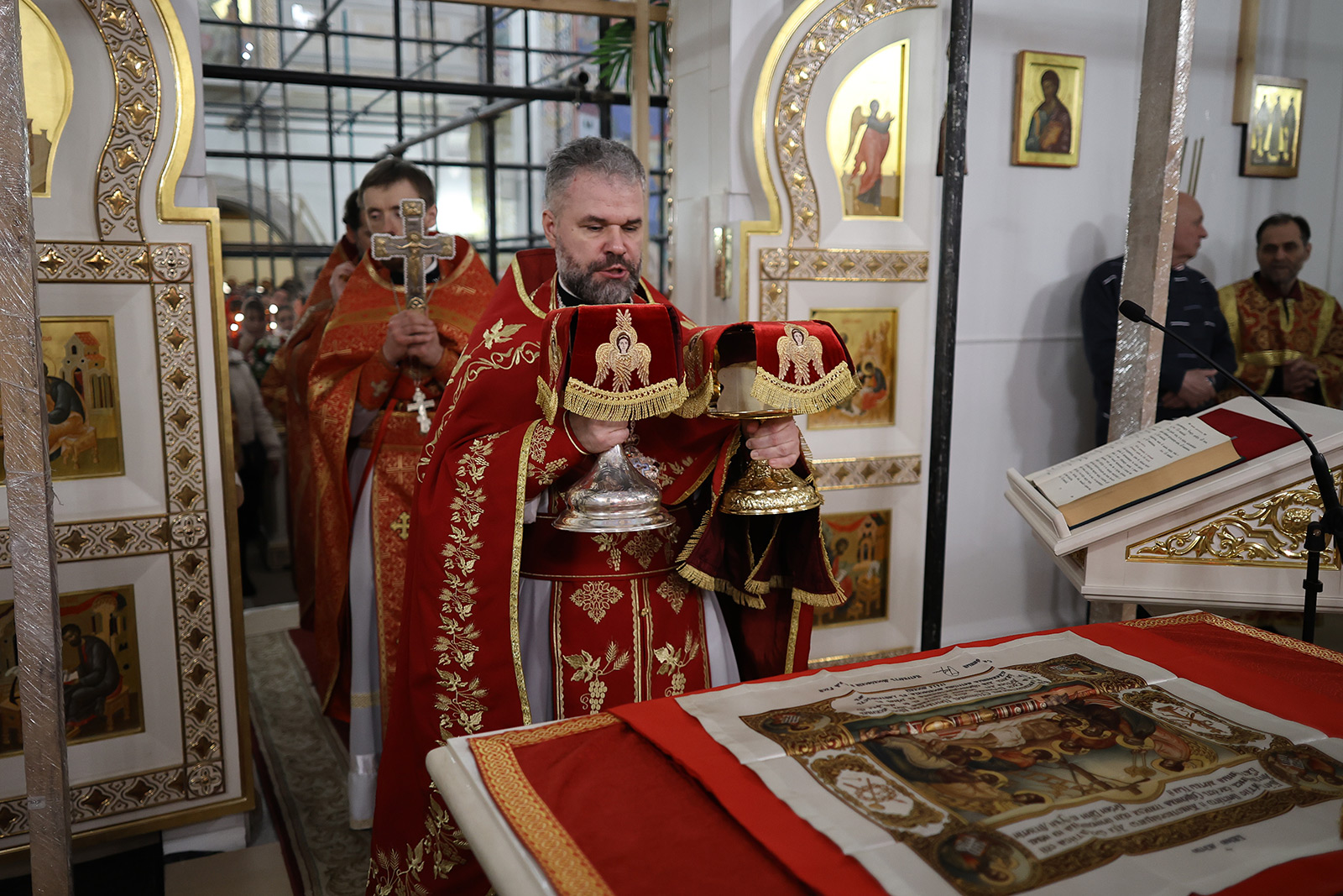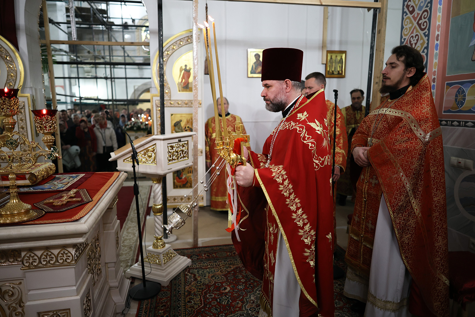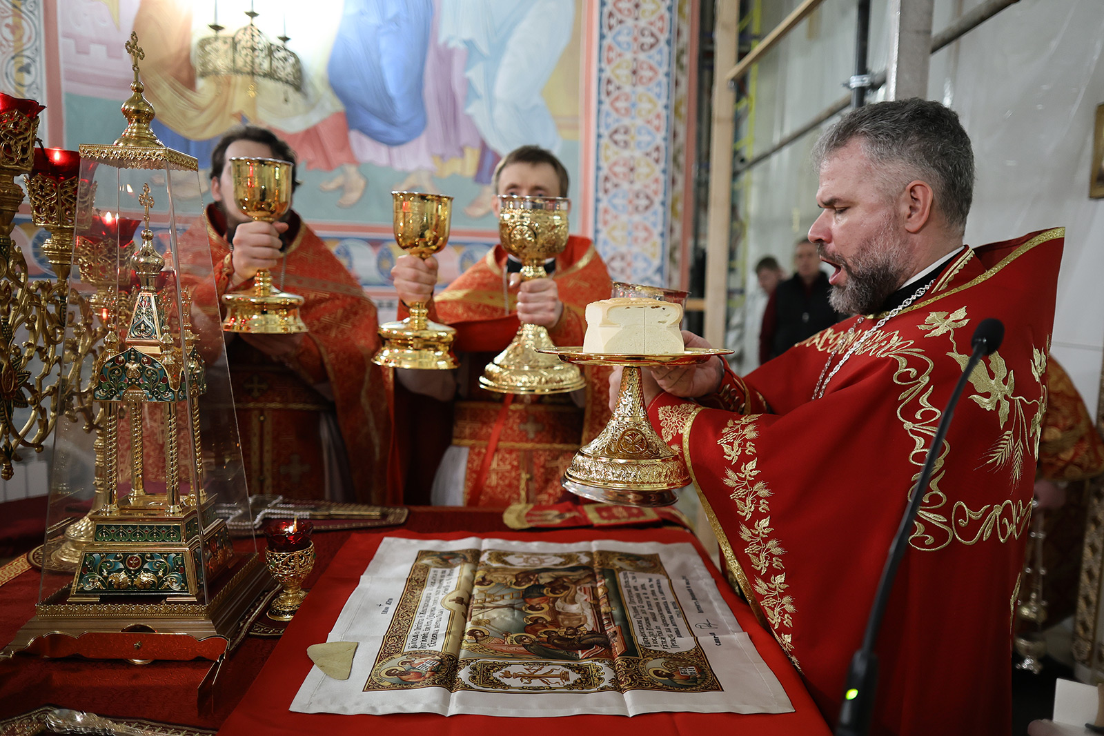 По завершении Литургии отец Димитрий освятил Артос – особый хлеб с изображением Креста или Воскресения Христова, который хранят в храме до следующей субботы, а потом раздают верующим.