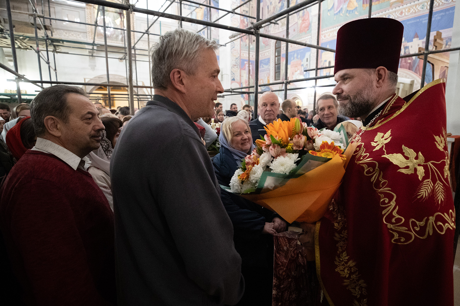 По окончании богослужения сотрудники храма вместе с прихожанами поздравили настоятеля протоиерея Димитрия Синицына с Воскресением Христовым, после чего отец Димитрий поблагодарил всех собравшихся за общую молитву и поздравил с праздником Светлой Пасхи: «Милостью Божией достигли мы спасительных дней. Дай Бог, чтобы это состояние радостного спокойствия и умиротворенности всегда пребывало в нас. И тогда проблем в жизни нашей, в жизни родных наших будет меньше, и Господь, видя это состояние в нас, скажет: «Это мой брат, это мой раб, нужно ему особо помочь». А когда мы слишком много думаем, много суетимся, Господь смеется над нами и говорит: «Подожду!» Пусть Господь всех нас укрепляет, пусть Господь дарует нам побольше радости.